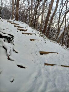 階段状の登山道になると、階段が見え隠れしていて雪の少なさがわかります。
