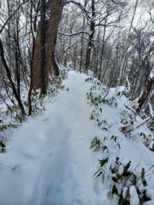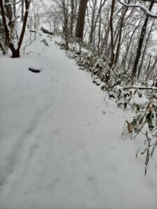 平坦な登山道に出ると、ここも先に登った登山者の靴跡は見られません。