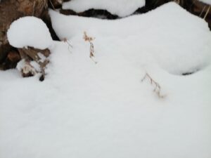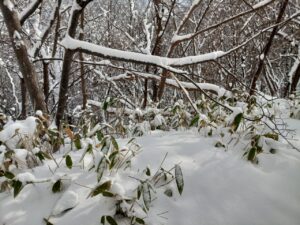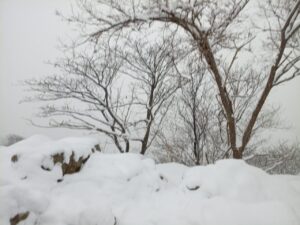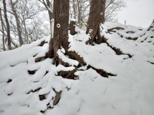 「円山」山頂は新雪に覆われています。「ハンノキ」の巨樹の根元も雪で覆われていました。すっかり枯れてしまった幼樹の葉先が雪の上に少しだけ見えました。