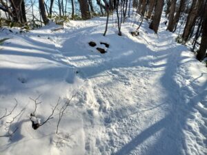 眩しいほどの青空と、登山道に樹影が長く雪面に映し出され