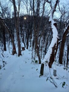 お天気の週間予報では、今週は毎日雪マークばかりです。猛吹雪にさえならなければ例え曇り空でもと思いつつ、気象情報には気にせずに「円山」登山口へ向かいました。予報に反して青空がどんどん広がっていきます。久しぶりの眩しいほどの太陽の輝きです。