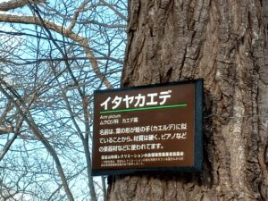 「ハンノキ」と思い込んでいた樹木には良くみると「イタヤカエデ」と木札がつけられていました。巨樹が「イタヤカエデ」でその中に生えていた幼木が「ハンノキ」なのでしょう。