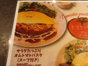 メニューによると「サラダたっぷりオムトマトパスタ(スープ付き)」とは、どんなの「オムライス」なのでしょうか。「ライス」ではなく「パスタ」なのです。これに決めました。