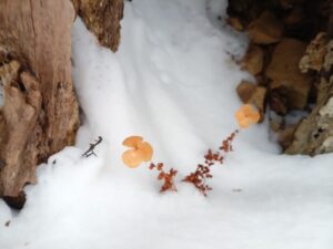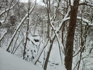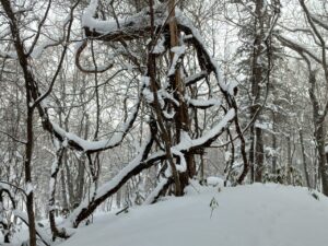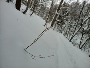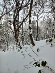 倒木に雪が降り積もり、楽しい形ができていました。春から秋にかけての登山では、咲いている花や実をつけた樹木に楽しさを感じてしまいますが、冬は偶然にできた雪のオブジェに関心があります。