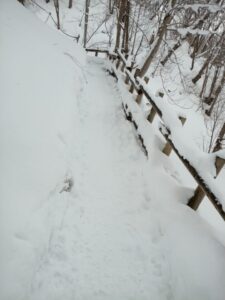 「階段状」の登山道が見えてきました。近付くと最初は階段状なのですが、途中からはすっかり雪に覆われ坂道の登山道に変わっていました。