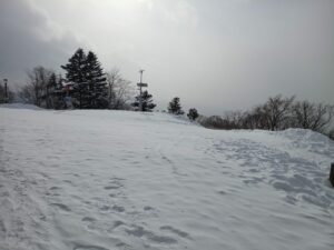 山頂まで、約4分の1地点の「日本初のスキーリフト跡地」が見えてきました。ここで、休憩をとる登山者が多いでのすが、「まだ、後4分の3を登りきろう。」と、心に留める地点です。