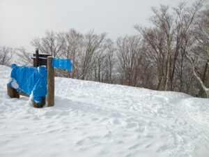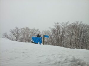 山頂へ辿り着くと、登山口からずっと粉雪が降っていたのに陽が差してきました。