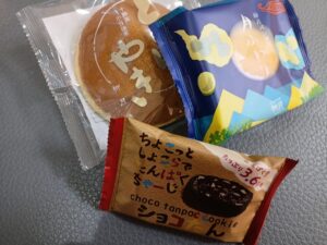 「どらやき」・「月ふわり」・「ちょこっとしょこらたんぱくちゃーじ」を一個ずつ、計三個を