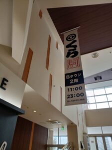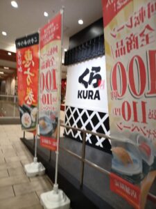 「くら 寿司」店内での写真は撮れませんので、お店の入り口のみの撮影です。アカガイ・ホタテ貝柱・アナゴ・イカ・みずがれい・カツオ・柚子塩かれい・ねぎマグロ・アボガドサーモン・海老などと頂きました。パリパリしていて、ここの大根ガリが大好きです。