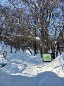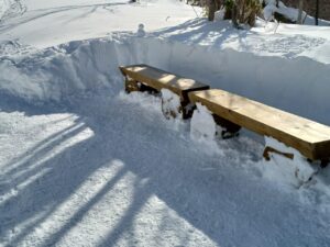 休憩用のベンチは雪に埋もれ、利用しやすい様に掘り起こされています。