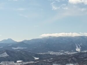 間も無く山頂という辺りで右側に目をやると支笏湖周辺の山々が見え、その中でも何故か「樽前山」だけが薄く輝いてるようでとても綺麗な光景でした。