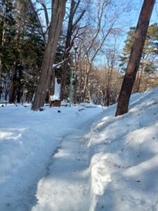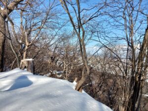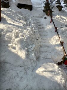いつになく短時間で下山できました。人一人が歩ける道幅の登山道で、階段上のところは踏みつけられた雪で全てが急坂になっていますが、ここの石段だけが綺麗に除雪されていました。ありがたいことです。