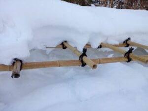 〜 「アジサイ」などが植えられているところは竹で冬囲いされ、重そうな雪から守られ 〜