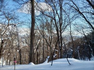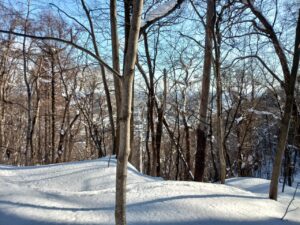 陽の光が樹木の向こうから眩しく照りつけてきます。雪がへばり付いた樹木の白いアーチを潜り抜けました。すると、そこは、パッと別世界が広がるように左右が明るく見渡せました。