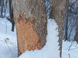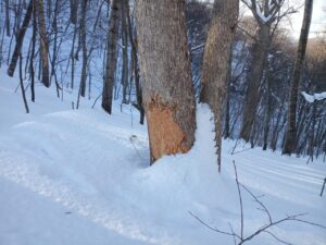 昨年末にクマが掻きむしったであろうと思われるあの樹木です。未だ、生々しく荒々しい爪痕がハッキリと残されていますが、このクマは、今、冬眠中なのでしょうか。