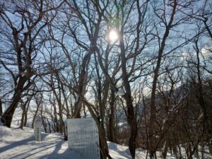 一面真っ白で、青空が眩しい「円山」山頂に辿り着きました。樹間から太陽の日差しが眩しく差し込んでいます。