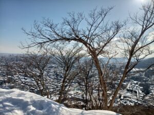 2月中旬の木曜日、青空が広がり春のようなポカポカとした陽気に誘われて「円山」登山口へ向かいました。歩道は堅雪で樹木にも雪が溶けずにへばり付いています。「アジサイ」などが植えられ竹で冬囲いされているところの雪も堅雪になっていました。