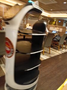 平日の木曜日でしたので、日替わりランチを利用することができました。木曜日は「ミニチーズinハンバーグデミソース&野菜コロッケ&ソーセージ」です。店内をロボットが食事を運んでいます。動きが素早くスマホカメラで撮るのも大変でした。