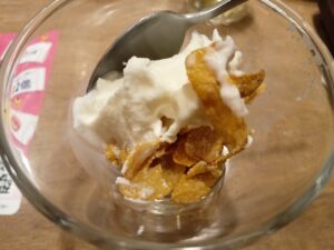 〜 ソフトクリーム 〜 これまでのソフトクリームのイメージと違っていて、コーンの上にソフトクリームがのっているのではなくガラスの器の下に「コーンフレーク」、そして、その上に「ソフトクリーム」がのっていました。「コーンフレーク」のサクサク感と甘さを抑えたソフトクリームとの相性抜群!