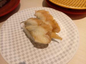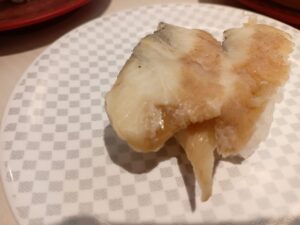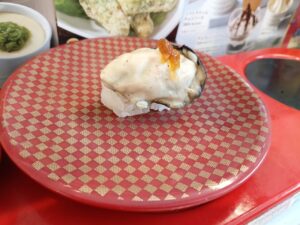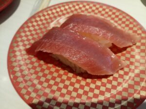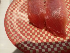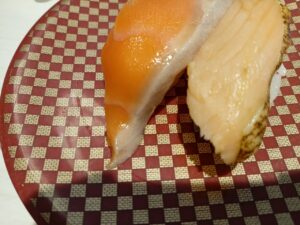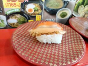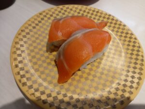 昼食時の回転寿司は何処もお昼時には混み合っていて、行列ができているところが多いのですが待ち時間もなく座席につけました。回転寿司の「魚べい」はタッチパネルで注文してから生寿司が乗ったお皿が届きます。真っ先にお馴染みの「サーモン」を頼みました。