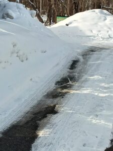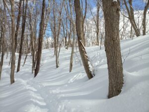 樹木が雪面に映し出す長い影に導かれるように登り続けると、「藻岩山」山頂のアンテナが見え隠れし始めたのであとひと頑張りと自分自身に気合を入れ直し、「疲れた〜。」という気持ちを打ち消しました。