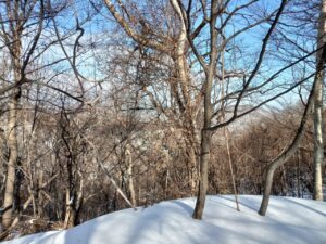 3月も中旬になると、吹く風の中にもどことなく真冬の寒さとは違ったふんわりとした温かさを感じさせられてしまいます。少し早起きをして「藻岩山」の「慈啓会病院」登山口へ一時間半くらい徒歩で向かいました。ビルの屋上越しに見える「藻岩山」山頂は青空です。
