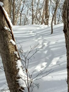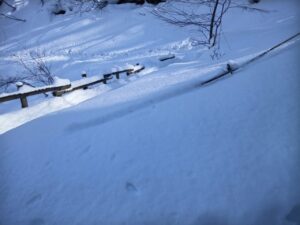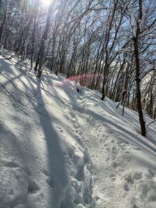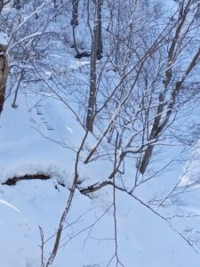 登りでは気付きませんでしたが、雪面に人の靴跡ではなく小動物の足跡が点々と付いていました。