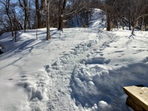 春の陽射しで登り始めの登山道は堅雪状態で、樹木の影が雪面に斜めに差し込んでいます。