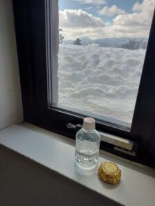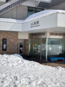 〜 「山頂駅」の休憩所で一休みして 〜 窓の向こうには晴天に恵まれた証拠とでも言って良いのでしょうか、ちょうど「恵庭岳」がクッキリと望まれます。
