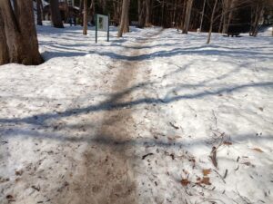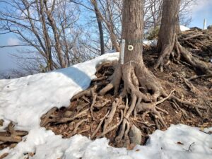 〜 雪解けが進み狭くなてしまった雪道の登山道と巨木の根 〜