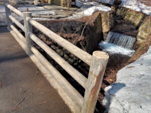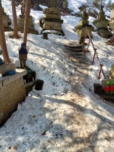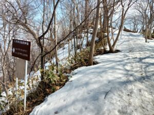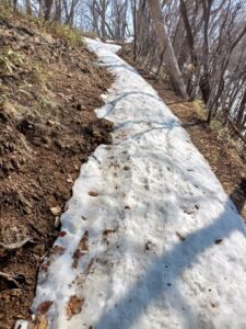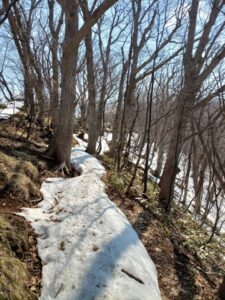 「円山川」を渡り登り始めると登山道周辺の雪解けはかなり進み、登山道が狭くなってしまったような錯覚さえ感じてしまうほどです。階段状の登山堂の雪も半分ほど溶けてしまいました。