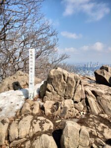 「おひとり様」で静かな山頂でしたが、暫くすると約20名ほどの中高年の団体さんで賑やかな「円山」山頂になってしまいました。団体記念写真を撮っていましたので、こちらから敢えて「本格的なカメラシャッター」の押し役になりました。