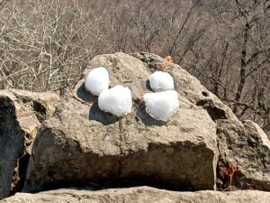 山頂岩場の後ろ側に回ってみると、四個の雪玉が小さな氷の塊のようになっています。